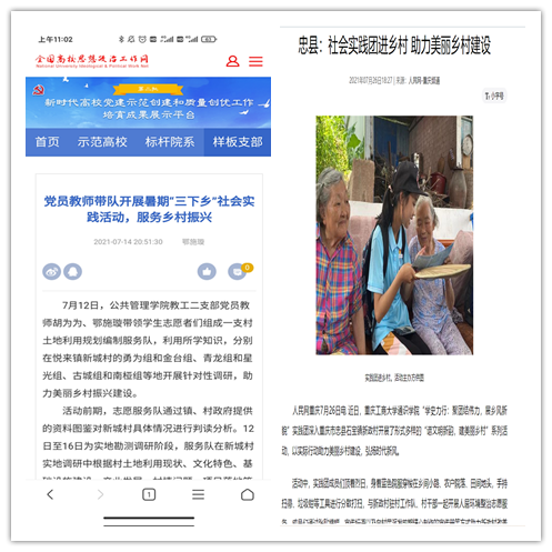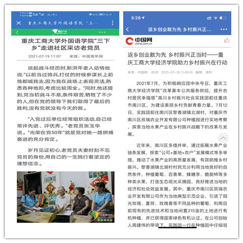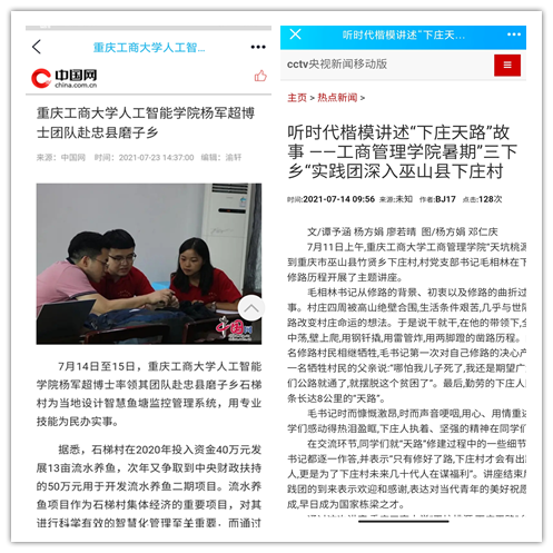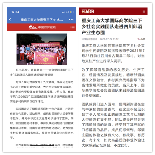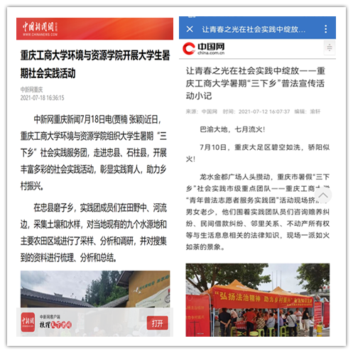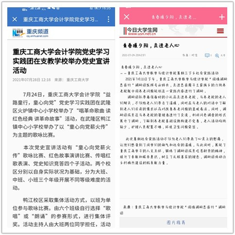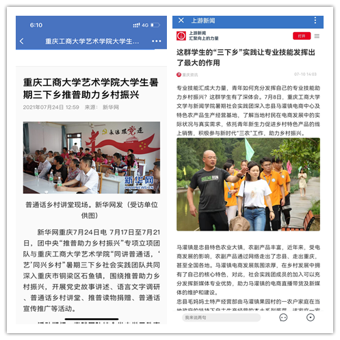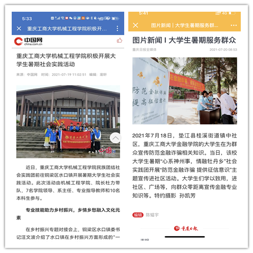 在实践活动期间,各学院创作多种类型的高质量社会实践作品,如《益路童行,童心向党--买球(中国)官方网站会计学院党史学习实践团在支教学校举办党史宣讲活动》《重庆工商学子赴古蔺县 看贫困户"搬"出幸福新生活》《返乡创业敢为先 乡村振兴正当时——买球(中国)官方网站经济学院助力乡村振兴在行动》《脱贫不忘来时路,乡村振兴靠大家——买球(中国)官方网站工商管理学院暑期“三下乡”实践团深入重庆市巫山县下庄村》等,引领广大青年学生在扎根中国大地的生动实践中增强“四个意识”、坚定“四个自信”、做到“两个维护”。实践团深入乡村基层,走访调查,理论宣讲,服务社会,在社会实践的亲身经历中受教育、长才干、做贡献,得到了当地群众及社会的认可,同时实践活动被新华网、人民网、中国青年网、央广网、中国网、中视网、重庆晚报、上游新闻、中国教育在线等多家媒体报道。