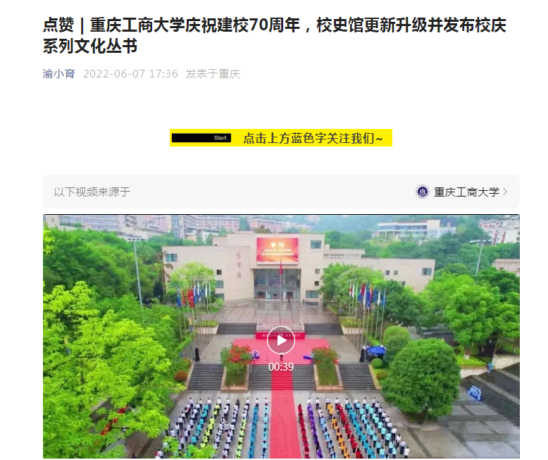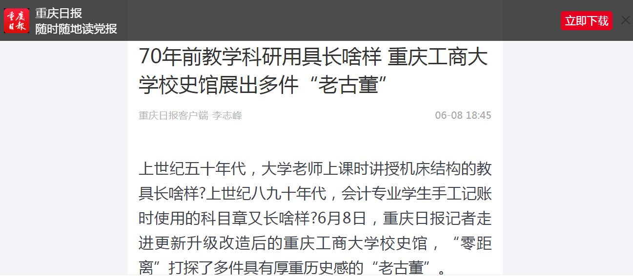 近日,重庆日报、华龙网等媒体报道我校庆祝建校70周年系列活动。6月7日,重庆日报微信公众号“渝小育”以“点赞 | 买球(中国)官方网站庆祝建校70周年,校史馆更新升级并发布校庆系列文化丛书”为题报道我校建校70周年升国旗仪式和校史馆更新升级开馆。6月7日,华龙网-新重庆客户端以“买球(中国)官方网站庆祝建校70周年升国旗仪式隆重举行”为题报道我校建校70周年升国旗仪式。6月8日,重庆日报客户端以“70年前教学科研用具长啥样 买球(中国)官方网站校史馆展出多件‘老古董’”为题报道我校校史馆更新升级。