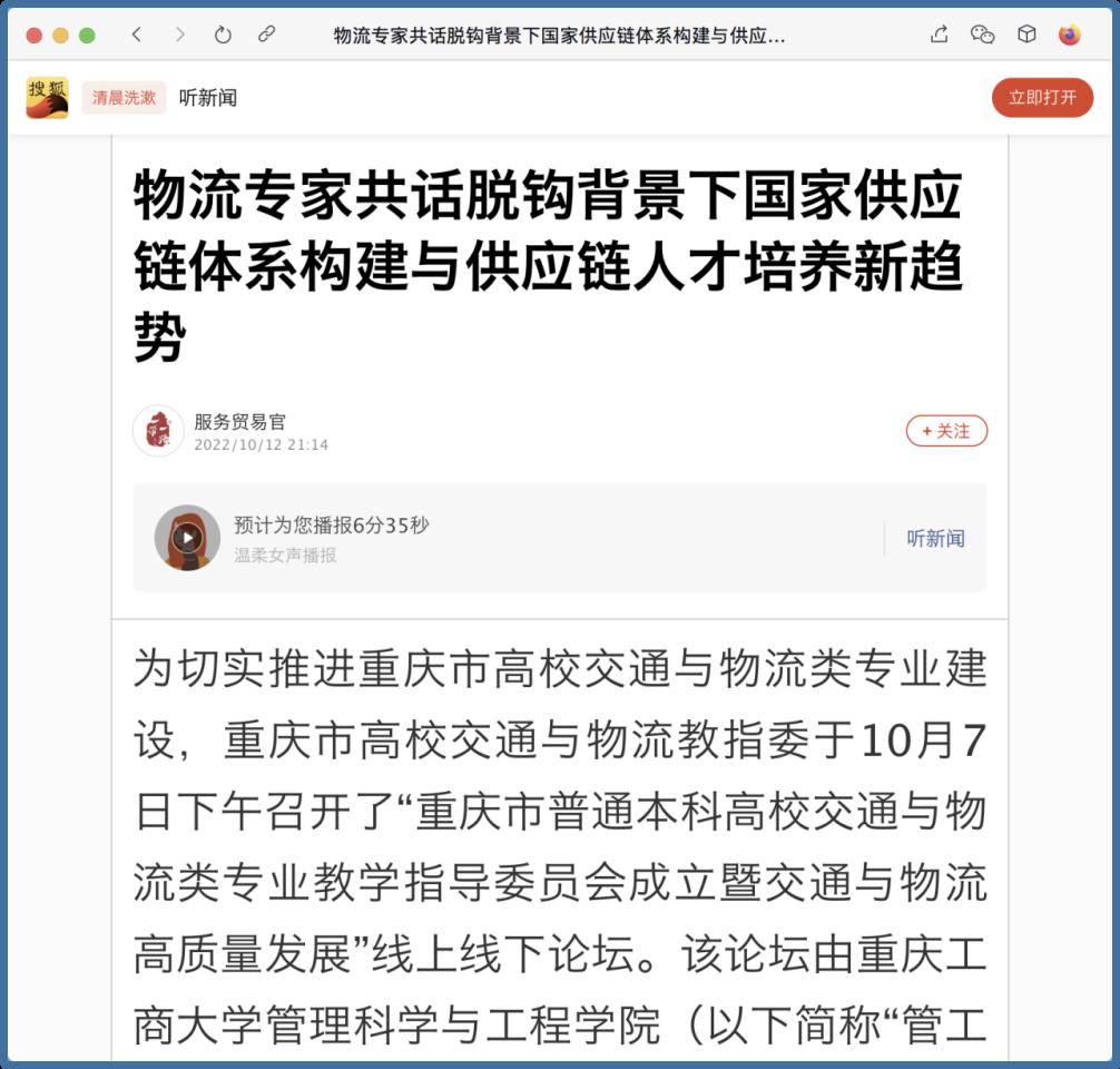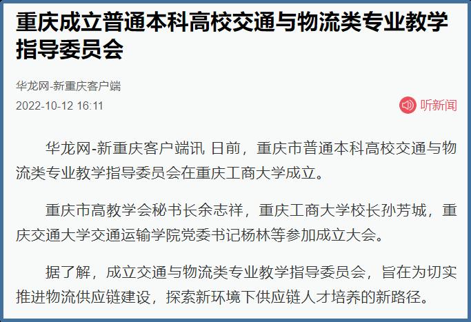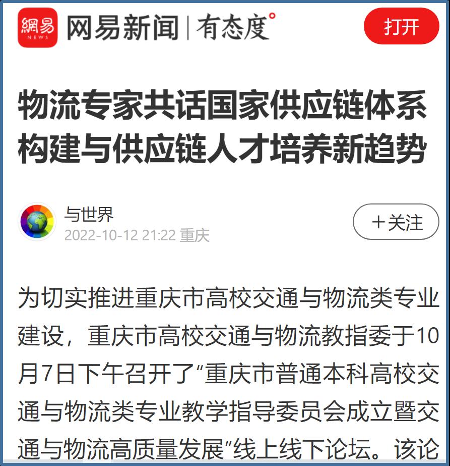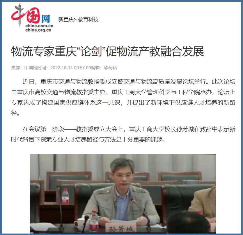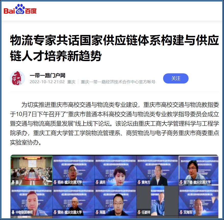 近日,中国网、工人日报、华龙网、今日头条、百度新闻、网易新闻、搜狐新闻等多家主流媒体聚焦交通与物流教指委成立、国家供应链体系构建、供应链人才培养新趋势等内容,对我校成功举办“重庆市交通与物流教指委成立暨交通与物流高质量发展论坛”进行广泛报道。成立大会上,买球(中国)官方网站校长孙芳城和市教委高教处处长蒋云芳致辞,高教学会秘书长余志祥宣读委员名单。论坛上教育部高校物流教指委主任黄有方、秘书长郭肇明、中国物流学会会长任豪祥、重庆市交通与物流教指委主任龚英、副主任雷林、副主任付启敏发表主旨演讲。圆桌会议上龚英、提出了工作计划,张军主任、冯利朋院长、陈坚副院长等就各自学校的一流专业经验进行了分享,其他委员为教指委的发展积极建言献策。会议由重庆市交通与物流教指委秘书长陈久梅和管理科学与工程学院院长黄钟仪副主任主持。来自教指委的委员以及全国各地物流本科院校的老师、行业协会等70余人参加本次论坛。
