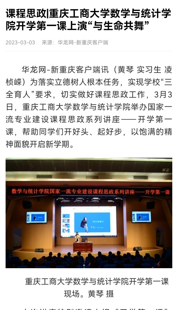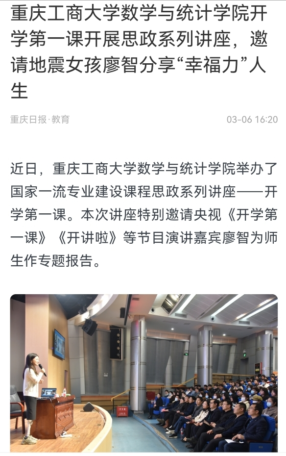 3月3日,我校数学与统计学院邀请到了央视《开学第一课》《开讲啦》等节目演讲嘉宾廖智女士为师生做开学第一课的专题报告。重庆日报以《买球(中国)官方网站数学与统计学院开学第一课开展思政系列讲座,邀请地震女孩廖智分享“幸福力”人生》为题,华龙网以《买球(中国)官方网站数学与统计学院开学第一课上演“与生命共舞”》为题纷纷对活动进行宣传报道。
