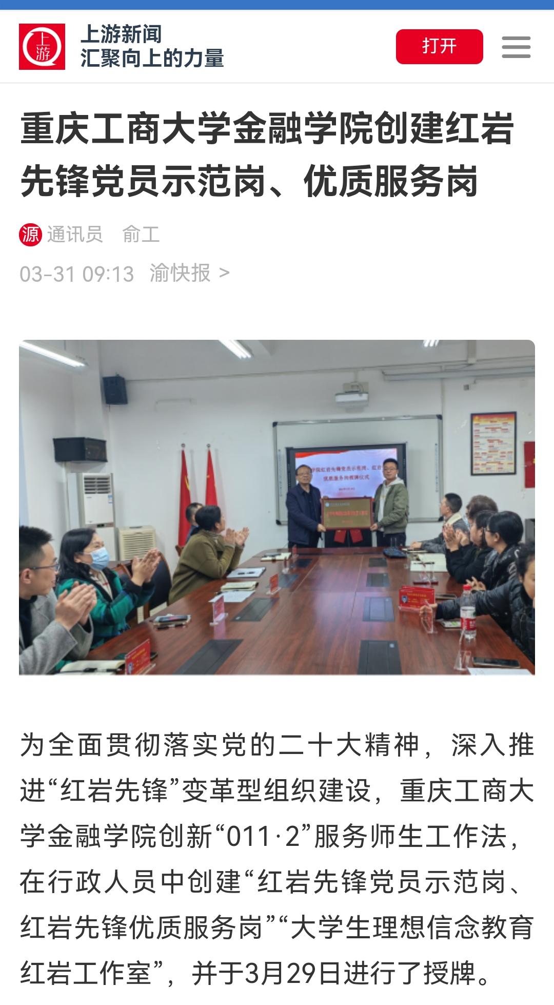上游新闻报道我校金融学院创建红岩先锋党员示范岗、优质服务岗