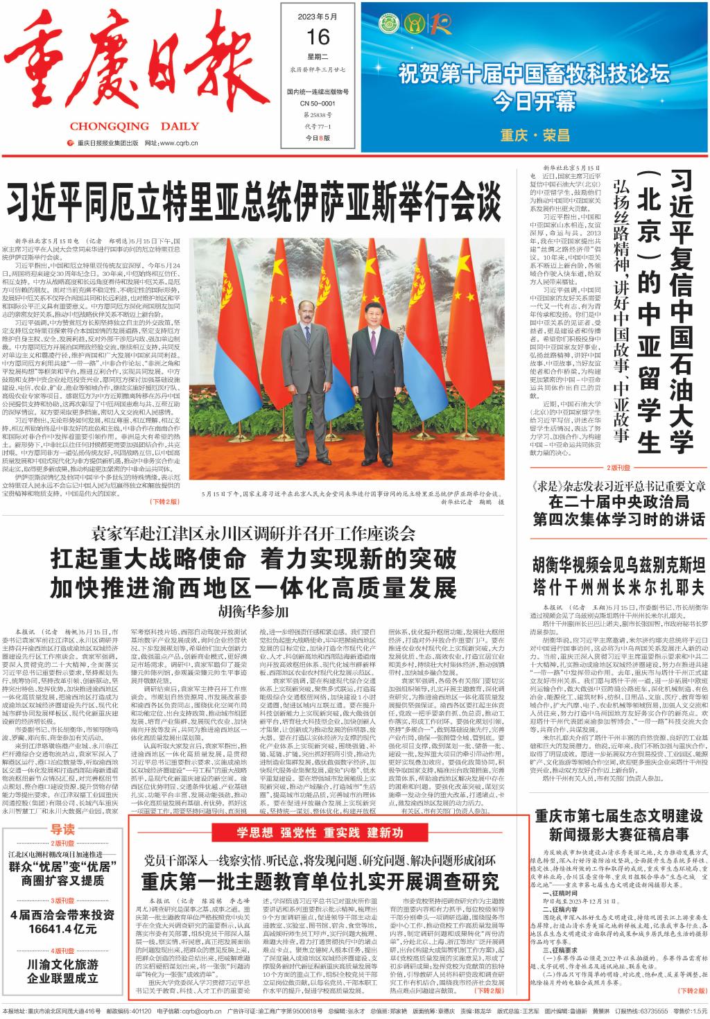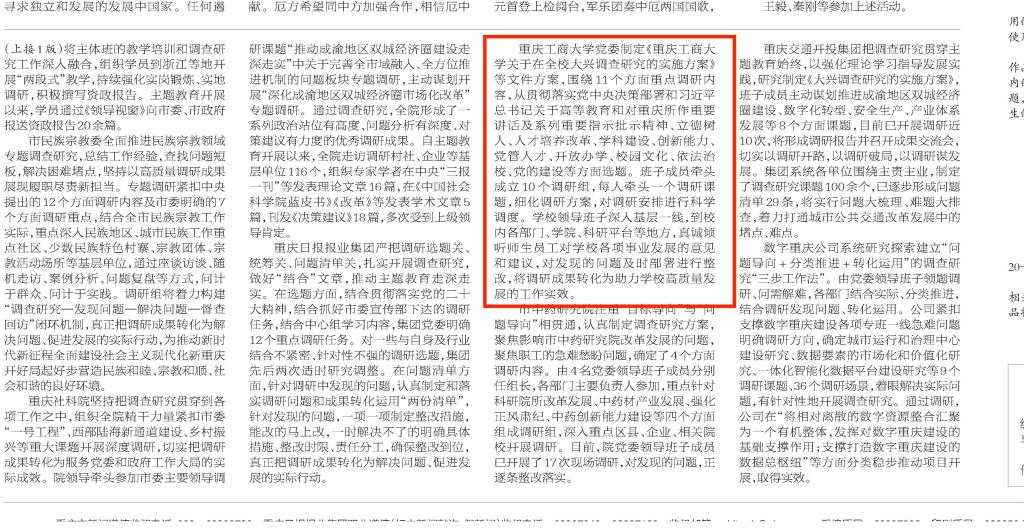 5月16日,重庆日报以《重庆第一批主题教育单位扎实开展调查研究》为题,报道我校扎实开展调查研究。报道中指出,学校党委制定《买球(中国)官方网站关于在全校大兴调查研究的实施方案》等文件方案,围绕11个方面重点调研内容,从贯彻落实党中央决策部署和习近平总书记关于高等教育和对重庆所作重要讲话及系列重要指示批示精神、立德树人、人才培养改革、学科建设、创新能力、党管人才、开放办学、校园文化、依法治校、党的建设等方面选题。班子成员牵头成立10个调研组,每人牵头一个调研课题,细化调研方案,对调研安排进行科学调度。学校领导班子深入基层一线,到校内各部门、学院、科研平台等地方,真诚倾听师生员工对学校各项事业发展的意见和建议,对发现的问题及时部署进行整改,将调研成果转化为助力学校高质量发展的工作实效。