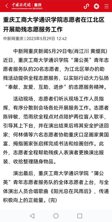 近日,央广网以《重庆学子开展“以青春之我,筑童心港湾”小学支教活动》为题,报道我校通识学院开展小学支教活动;中国新闻网以《买球(中国)官方网站通识学院志愿者在江北区开展助残志愿服务工作》为题,报道我校通识学院志愿者参与江北区助残活动。