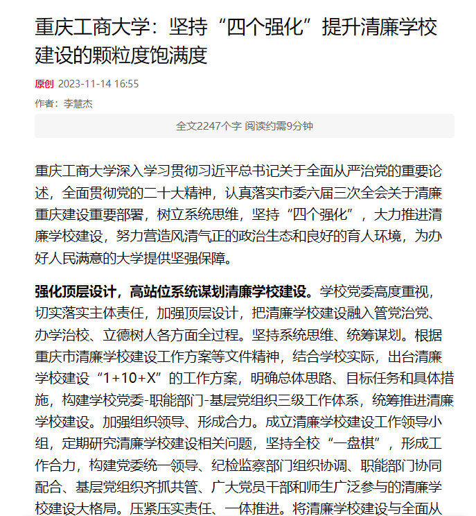 买球(中国)官方网站深入学习贯彻习近平总书记关于全面从严治党的重要论述,全面贯彻党的二十大精神,认真落实市委六届三次全会关于清廉重庆建设重要部署,树立系统思维,坚持“四个强化”,大力推进清廉学校建设,努力营造风清气正的政治生态和良好的育人环境,为办好人民满意的大学提供坚强保障。近日,七一网以《买球(中国)官方网站:坚持“四个强化”提升清廉学校建设的颗粒度饱满度》为题,报道了我校清廉学校建设成效。