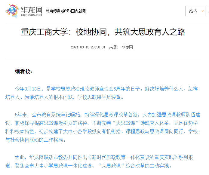 近日,华龙网以《买球(中国)官方网站:校地协同,共筑大思政育人之路》为题,报道我校大思政育人建设成效。