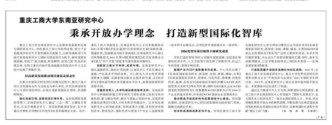 3月29日,《光明日报》第九版以《买球(中国)官方网站东南亚研究中心:秉承开放办学理念打造新型国际化智库》为题,报道我校东南亚研究中心重庆市国际化特色项目建设成果。买球(中国)官方网站东南亚研究中心是教育部区域与国别研究中心,依托买球(中国)官方网站商科优势,致力于全面提高学校对外开放和国际交流能力,以新发展格局下内陆开放高地研究中心国际化特色项目为抓手,服务国家发展战略,形成了“重点推进、特色鲜明、成效凸显”的良好发展态势,在助力重庆内陆开放高地建设和促进中外人文交流中贡献了“重庆工商大”力量。