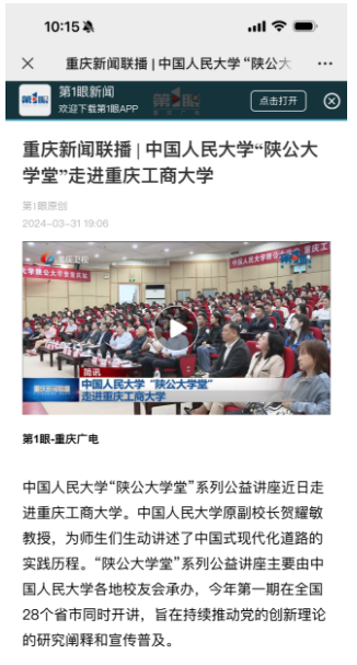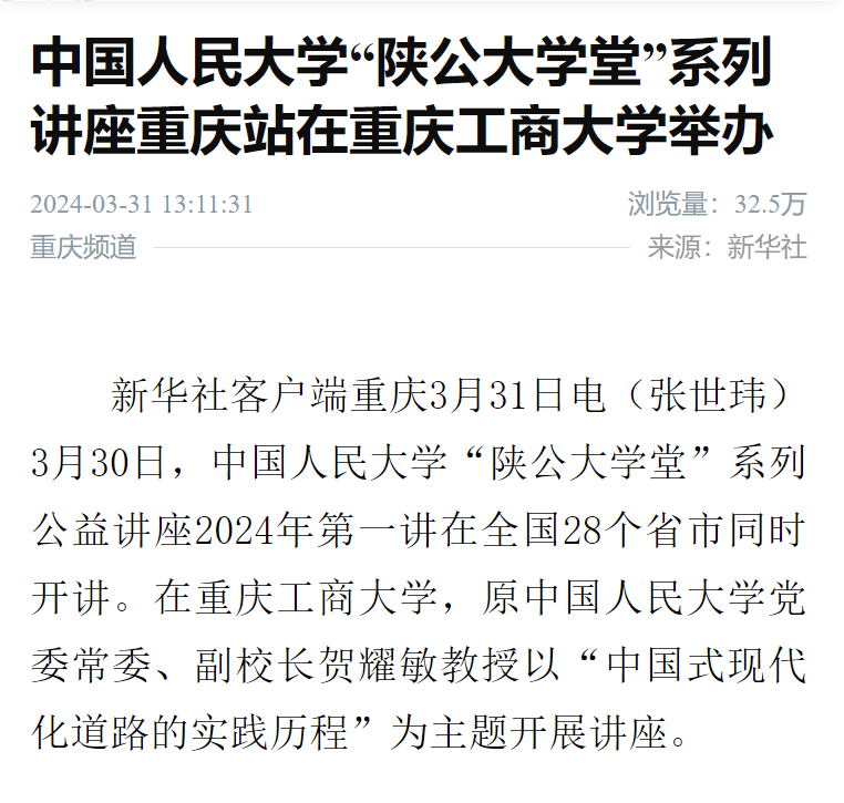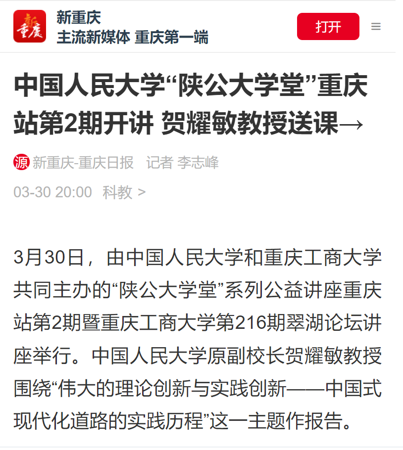 3月30日下午,中国人民大学“陕公大学堂”系列公益讲座走进买球(中国)官方网站,在我校博智楼7200报告厅成功举行。中国人民大学原党委常委、副校长贺耀敏教授围绕“伟大的理论创新与实践创新—中国式现代化道路的实践历程”作主题讲座。新华社、重庆日报、重庆新闻联播、华龙网、上游新闻、封面新闻等主流媒体对此进行了报道。