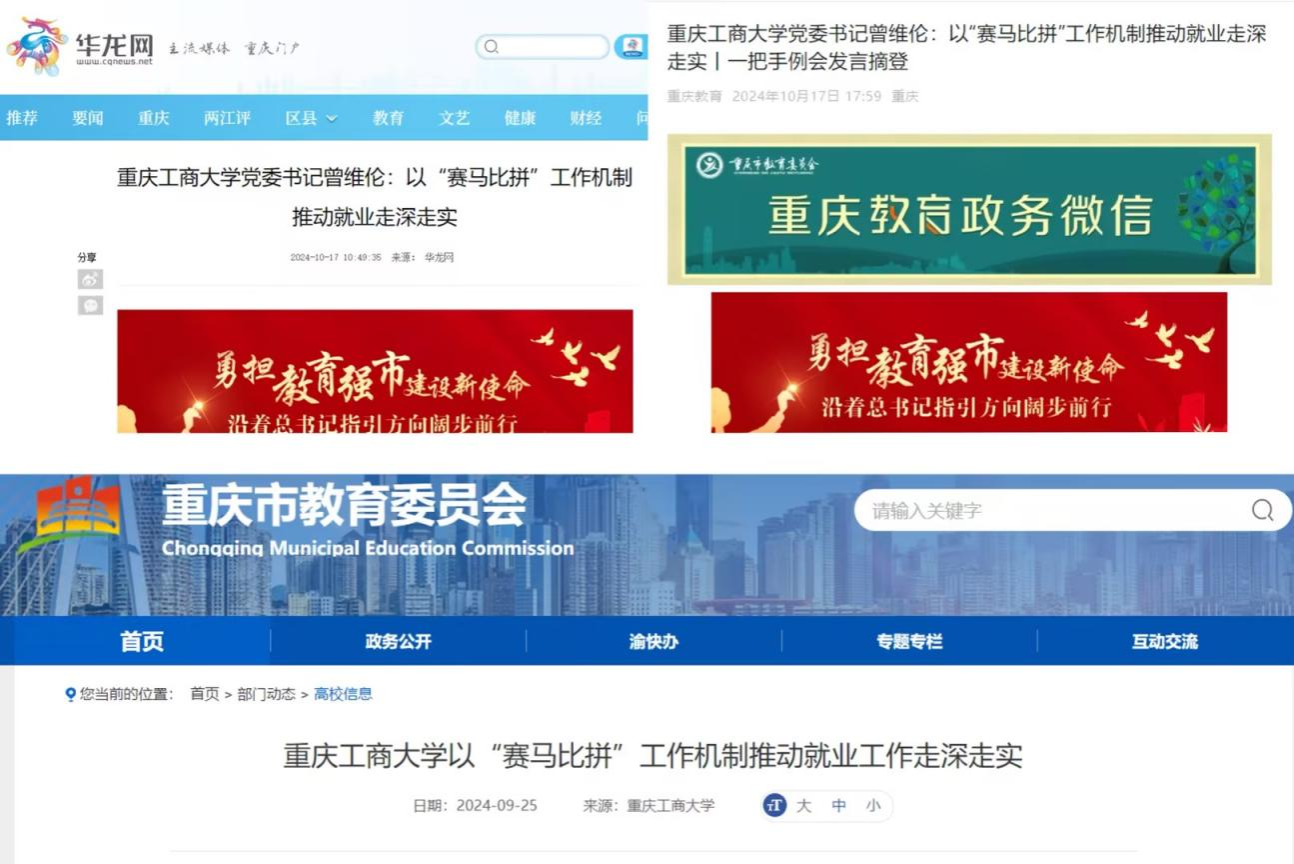 9月26日,市委教育工委、市教委举行了2024年度市属高校一把手例会,学校党委书记曾维伦作为就业工作经验分享唯一高校代表,以“赛马比拼推动高质量就业走深走实”为题,进行了现场交流发言。华龙网对发言内容进行了摘登,同时,市教委官网、“重庆教育”微信公众号进行了转载报道。