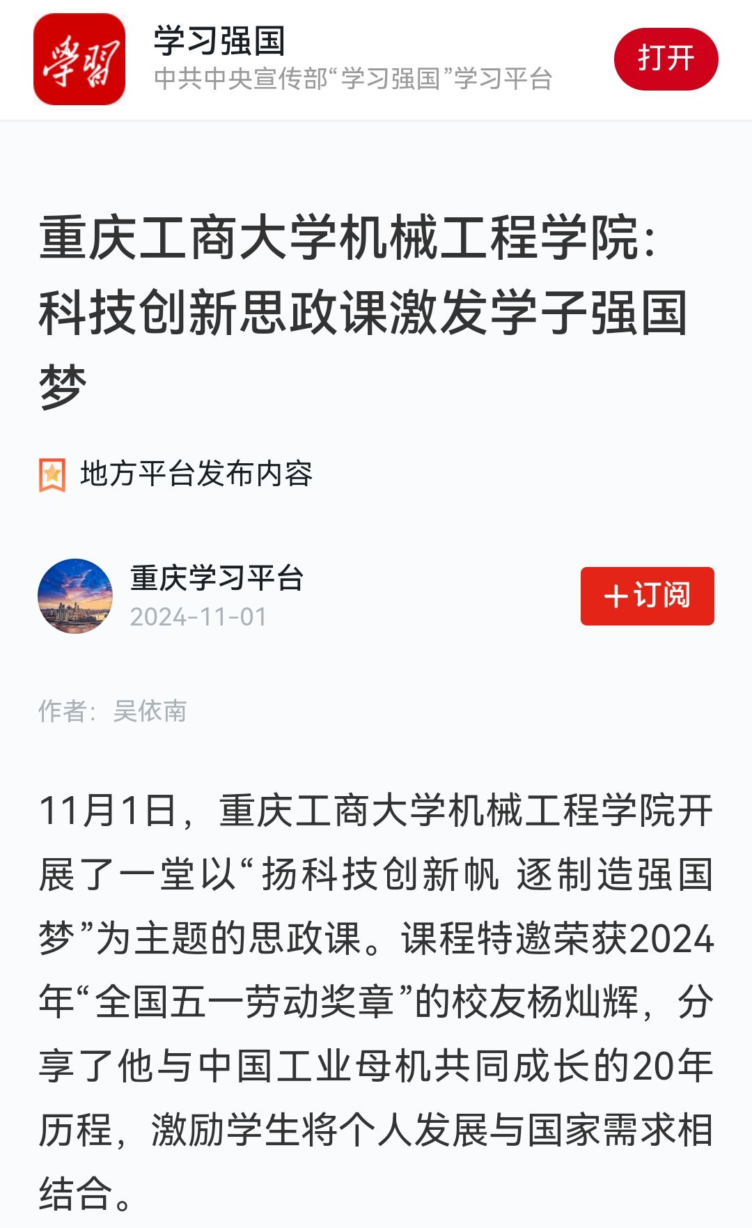 11月1日,机械工程学院开展了一堂以“扬科技创新帆 逐制造强国梦”为主题的思政课。课程特邀荣获2024年“全国五一劳动奖章”的校友杨灿辉,分享了他与中国工业母机共同成长的20年历程,激励学生将个人发展与国家需求相结合,在专业学习和实践中担负起强国建设使命。学习强国平台以《买球(中国)官方网站机械工程学院:科技创新思政课激发学子强国梦》为题进行了报道。