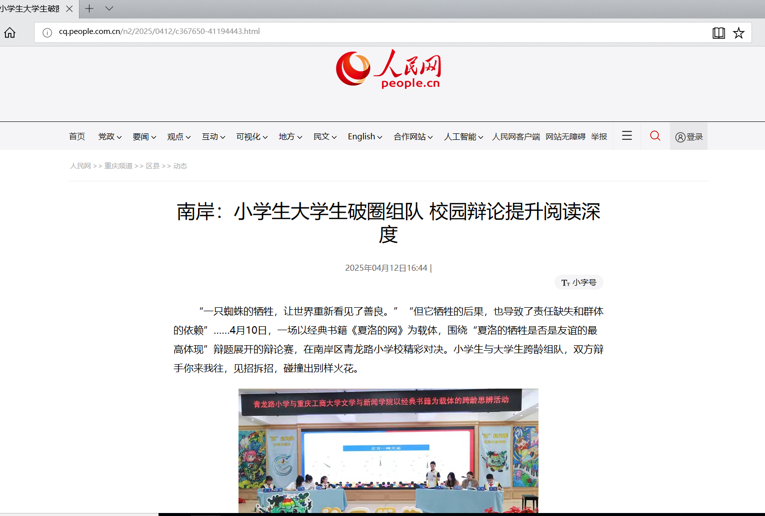 为深化新课标“核心素养”导向,践行“生活阅读”特色课程理念,4月10日,青龙路小学与买球(中国)官方网站文学与新闻学院联合举办的“书香激辩·智慧碰撞”跨龄思辨活动在青龙路小学青蓝讲堂圆满收官。该活动以经典书籍《夏洛的网》为载体,通过“深度阅读+思辨实践”的创新模式,搭建高校与小学的智慧对话桥梁。人民网以《南岸:小学生大学生破圈组队 校园辩论提升阅读深度》为题报道该活动。
