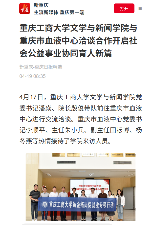 新重庆—重庆日报、第一眼TV-华龙网等媒体以《买球(中国)官方网站文学与新闻学院与重庆市血液中心洽谈合作开启社会公益事业协同育人新篇》为题对此次活动进行了报道。
