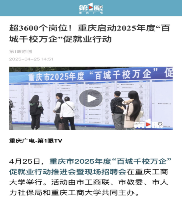 3. 重庆第一眼新闻:《超3600个岗位!重庆启动2025年度“百城千校万企”促就业行动》