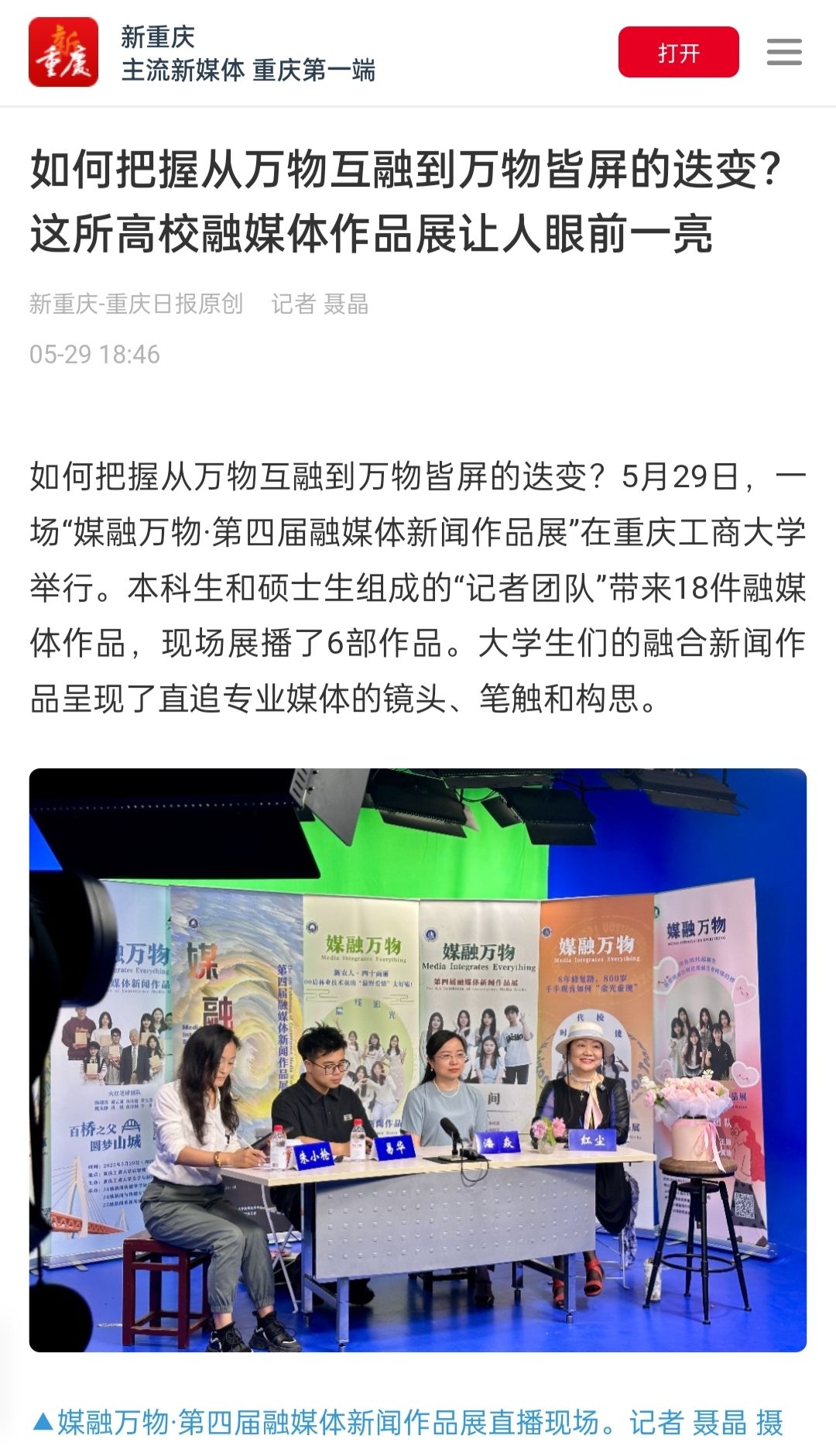 新华网以《买球(中国)官方网站举办第四届融媒体作品展》为题,新重庆-重庆日报以《如何把握从万物互融到万物皆屏的迭变?这所高校融媒体作品展让人眼前一亮》为题,纷纷报道了本次活动。