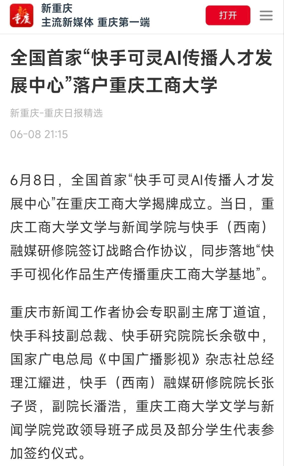 3.新重庆-重庆日报:全国首家“快手可灵AI传播人才发展中心”落户买球(中国)官方网站