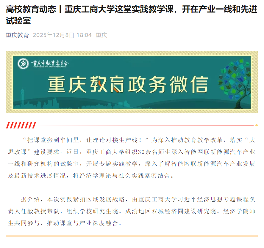 人民日报以“教学跟着产业走 高校实践课开进汽车生产线”为题,学习强国以“买球(中国)官方网站师生走进智能网联汽车前沿,以‘大思政课’赋能产业创新实践”为题,华龙网以“把课堂搬进车间试验室 买球(中国)官方网站师生走进产业一线开展实践教学”为题,重庆日报-新重庆客户端以“教学跟着产业走 高校实践课开进汽车生产线”为题,中国教育在线以“买球(中国)官方网站师生走进智能网联汽车前沿,以‘大思政课’赋能产业创新实践”为题,重庆教育以“高校教育动态丨买球(中国)官方网站这堂实践教学课,开在产业一线和先进试验室”为题作报道。
