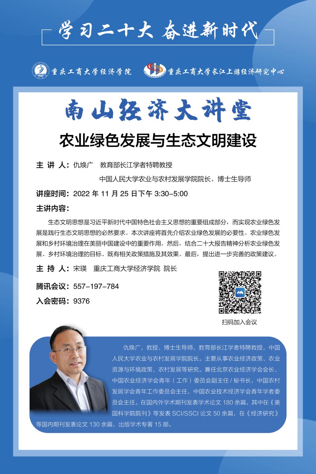 主讲人简介:教授、博士生导师,中国人民大学农业与农村发展学院院长。主要从事农业经济政策、农业资源与环境政策、农村发展等研究。兼任北京农业经济学会会长、中国农业经济学会青年(工作)委员会副主任/秘书长,中国农村发展学会青年工作委员会主任,中国农业技术经济学会青年学者委员会主任。在国内外学术期刊发表学术论文180余篇,其中在《美国科学院院刊》等发表SCI/SSCI论文50余篇,在《经济研究》等国内期刊发表论文130余篇,出版学术专著15部。