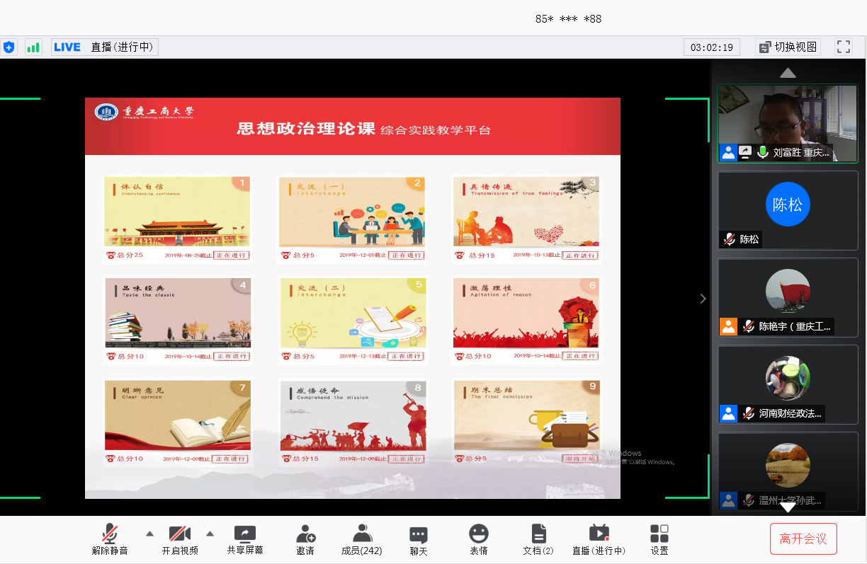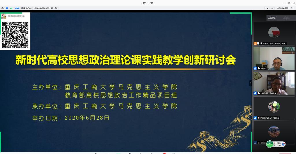 李志雄书记对各位专家学者参与会议表示热烈欢迎。他指出,学校党委和行政高度重视马克思主义学院、马克思主义理论学科和思想政治理论课建设,积极打造思想政治理论课金课。学校马克思主义学院全力提升思想政治理论课实效,按照“政治高度、理论深度、课堂热度和持续效度”的评价标准,重点推进专题化教学、综合化实践、立体化考核等三大改革。学校长期坚持思想政治理论课实践教学探索,上个世纪末开展的“家长学生两地书”活动,入选了中共中央宣传部宣教司、教育部社会科学司与思想政治工作司、共青团中央学校部主编的《加强和改进大学生思想政治教育优秀案例选编》,中央电视台、人民日报、光明日报、中国青年报、中国教育报等全国百余家主流媒体进行了报道。2017年开始,我校面向全体本科生开设了《思想政治理论课综合实践》公共必修课,对思想政治理论课实践教学进行了新探索,并取得较好效果。“‘互联网+’环境下高校思想政治理论课实践教学‘三结合’模式探索”入选2019年度教育部高校思想政治理论课教学方法改革项目择优推广计划,“思想政治理论课综合实践”被重庆市教委推荐参评国家级本科一流课程,“‘三支撑三覆盖两结合’的思想政治理论课实践育人模式”入选2020年全国高校思想政治工作精品项目。李书记强调,我校在思想政治理论课建设方面取得的成绩与兄弟院校专家学者的帮助密不可分,在疫情防控期间通过网络召开这次云端会议,就是要进一步聆听专家学者的意见建议,进一步学习兄弟高校的先进经验,进一步推动思想政治理论课实践教学创新,进一步彰显“思想政治理论课是落实立德树人根本任务的关键课程”的地位和作用。