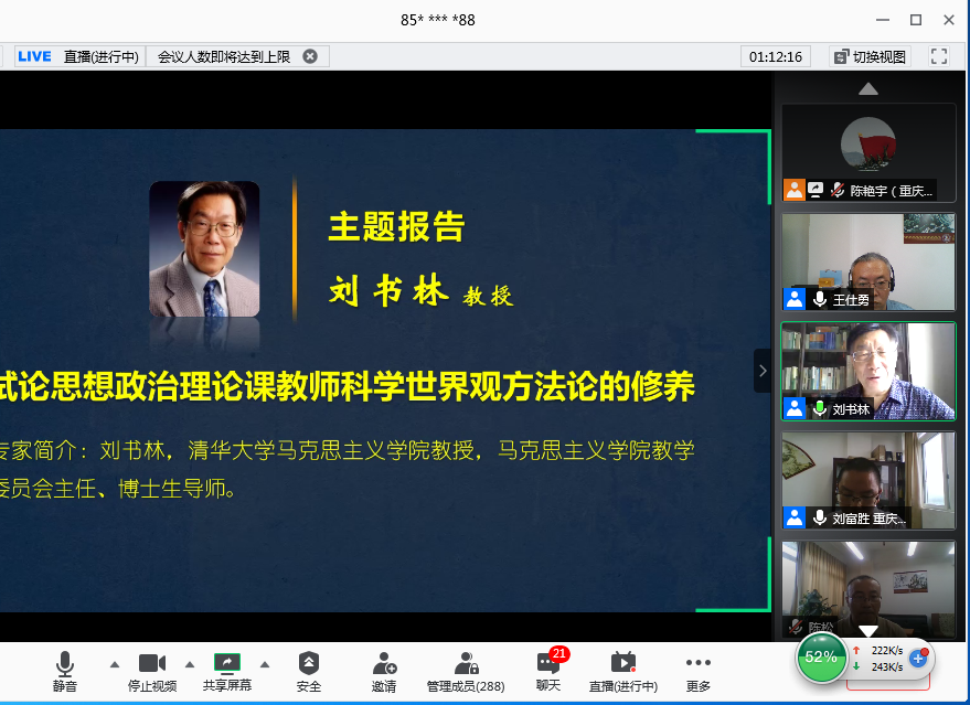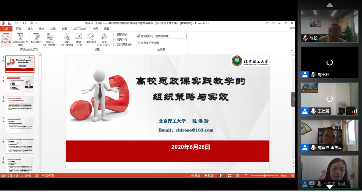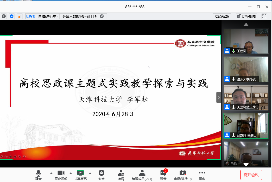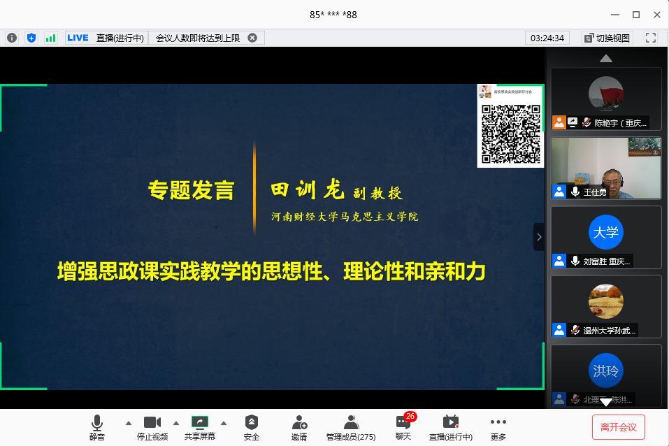 6月28日上午,由买球(中国)官方网站马克思主义学院、教育部高校思想政治工作精品项目组主办的“新时代高校思想政治理论课实践教学创新研讨会”在腾讯会议平台召开。来自清华大学、北京理工大学、温州大学、天津科技大学、河南财经政法大学和买球(中国)官方网站的六所高校的专家做了主题报告或专题发言。学校党委书记李志雄同志出席会议并致辞。来自全国106所高校的300余位专家学者参加了会议。会议由我校马克思主义学院院长王仕勇主持。