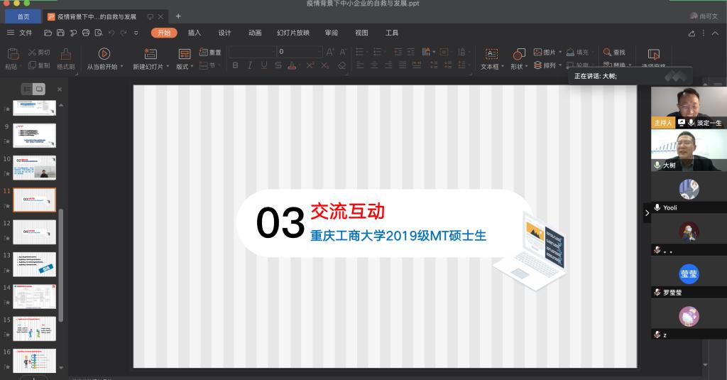 沙龙共分四个环节:背景介绍、案例分享、交流互动、沙龙总结。首先,尚可文教授从2019年末的新冠病毒疫情彻底打破了人们的生产生活规律入手,结合疫情背景下政府多措并举力挺企业发展的税收政策,阐述了举办这次沙龙的意义及目的。案例分享环节由张生军博士以迅驰车业江苏有限公司为例,分析了疫情背景下企业在资金、人才、市场、供应链等环节遭遇的困境,从节流和开源两个角度提出了疫情背景下中小企业如何开展自救。一方面要节流,尽量做到少花钱、不花钱、阶段性不花钱,另一方面要开源,通过银行借钱、员工参与、股东增资等渠道多找钱,特别是要通过银行委托贷款有效缓解中小企业资金困难。张生军博士用朴实的语言、生动的事例、广博的知识给大家奉献了一场很接地气的学术盛宴。随后,他与税务硕士研究生就疫情期间的税收政策效果、银行委托贷款的操作流程、企业如何拓展市场等问题进行了互动交流。尚可文教授对本次沙龙做了总结发言,他提出疫情背景下实体经济机遇与挑战并存,企业应抓住市场商机、发展商机、管理商机主动作为,面对市场萎缩、用工瓶颈、流动性不足的挑战迎难而上,用足用活疫情背景下政府出台的延迟纳税、延期纳税、延续政策、延亏抵补、联动金融、鼓励捐赠、优化服务等七大税收政策,通过构建多元化发展战略积极突围。
