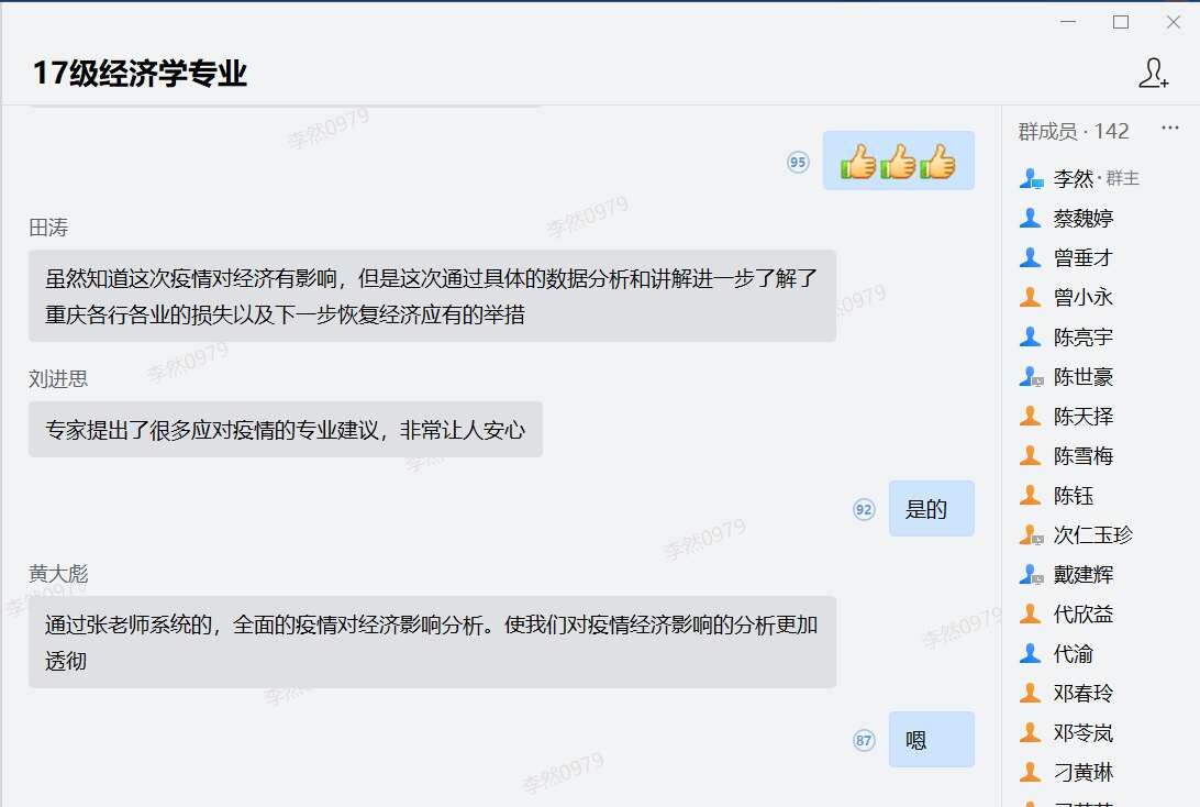 培育具有中国情怀、全球视野的中国特色社会主义经济学人才,引导学生树立正确世界观和人生观,正确理解和认识我国历史经验和当代实践所提出的理论命题和实际问题,是我校经济学类专业教育教学改革面临的重大使命。以世情国情民情教育为主线的“行业精英进课堂”活动,有效将思想政治教育与专业教育融合、显性教育与隐形教育相结合,学习中国理论、认识中国故事、倡导中国经验,潜移默化,立德树人,是课程思政的有效实现方式。本次活动结合了当前大家最为关心的疫情问题,深化了对中国各行各业现实问题的思考,让学生真正的“学以致用”。此外,行业专家们还为学生进行了价值引导,如重庆商社(集团)有限公司张泽军部长强调专业学习与综合素养的结合,寄往学生成为有情怀、敢担当、懂经营、会管理、能领导的卓越人才。重庆西朗进出口贸易有限公司刘丹总经理对“谈判的本质是取得信任, 而不是说服对方”进行阐述,勉励学生成为人生赢家。