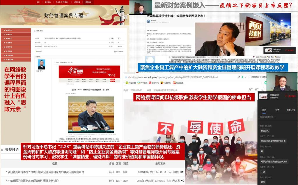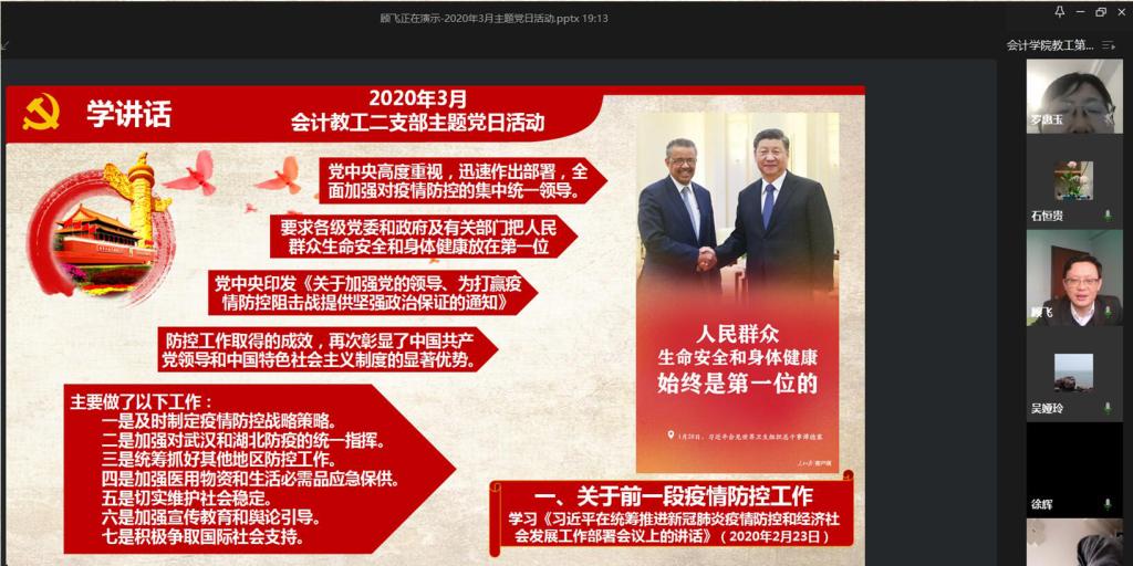 为了切实抓好新冠疫情防控期间的基层党建工作,有效促进党员政治理论学习成果向教学、科研协同转化,为打好疫情防控战、扎实推进学院各项工作有序开展提供坚强的政治思想保障,根据校党委统一安排部署,会计学院党委以网络为党建创新抓手、以党支部网络主题党日活动为平台、以网络课程思政为载体,积极推进了以“学讲话、抗疫情、抓教学、促科研、育新人”为主题的系列工作。