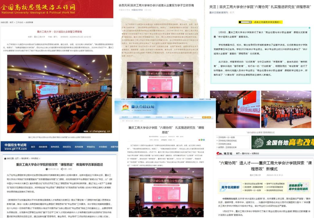 据悉,会计学院历来就高度重视课程思政建设,在坚持近20年不间断开展“不做假账从考试不作弊开始”的诚信“免监考”课程思政的基础上,近年来又基于“以一流课程思政引领一流专业和一流课程建设”的卓越课程思政理念,探索形成了“德、知、能一体 教、学、做合一”的财会类专业课程思政协同育人新模式,形成了“课程-专业-学科”闭环衔接、本硕联动的“大课程思政”育人格局。学院基于“财务管理案例”本科课程实践所凝练而成“一体两翼三结合六协同”课程思政融合应用创新案例,被学校推荐参评“2019年度重庆市高校在线课程建设与应用示范案例”;基于“商业伦理与会计职业道德”硕士研究生课程实践探索所凝练而成的“六育协同”课程思政模式被“中国教育在线”“全国高校思想政治工作网”以及“中国会计学会”“重庆市财政局”官微官网等主流媒体关注报道。