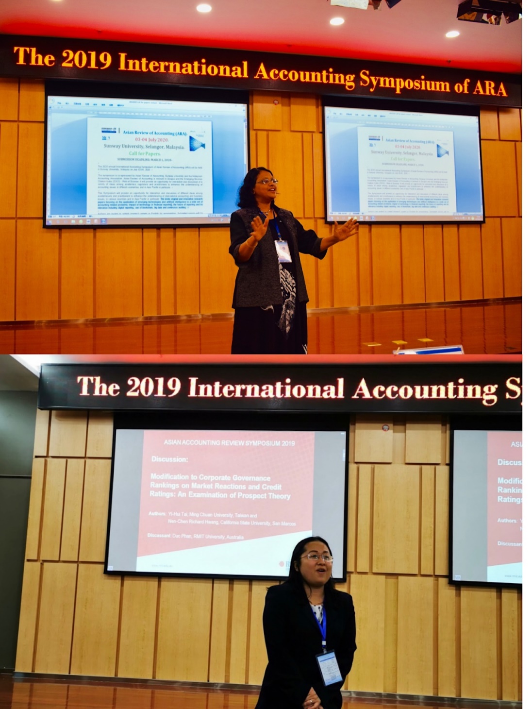 最后,下一届承办方澳大利亚皇家墨尔本大学的Duc Phan教授和马拉西亚双威大学、马拉西亚会计学会会长Susela Devi教授分别发言。他们首先对买球(中国)官方网站成功举办2019年亚洲会计评论学术年会表示祝贺,并对有机会承办2020年学术研讨会表示衷心的感谢。随后,Duc Phan教授和Susela Devi教授分别通过短视频方式对皇家墨尔本大学和双威大学进行了介绍,并诚挚邀请各位专家学者参加2020年的学术年会。