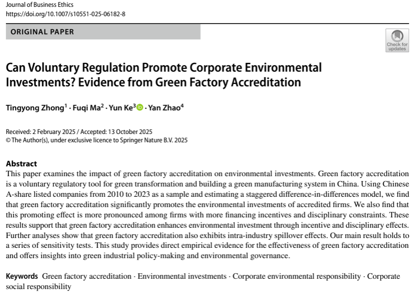 近日,我校会计学院在服务国家“双碳”战略相关研究领域取得新进展。会计学院钟廷勇教授作为第一作者、以买球(中国)官方网站为第一署名单位的研究团队,其学术论文《自愿性规制能否促进企业环保投资:来自“绿色工厂”认证的证据》(Can Voluntary Regulation Promote Corporate Environmental Investments? Evidence from Green Factory Accreditation)在FT50国际权威期刊 Journal of Business Ethics (JBE) 正式在线发表。该研究聚焦于“双碳”目标背景下,如何有效引导企业进行绿色转型这一重要议题。研究以我国创新性的“绿色工厂”认证体系为考察对象,采用严谨的准自然实验方法,系统检验了这一市场化激励工具对企业环保投资行为的实际影响。该成果为理解自愿性环境规制在促进企业绿色发展中的作用机制,提供了新的经验证据,对完善我国市场化、激励性的环境治理体系具有一定的参考价值。