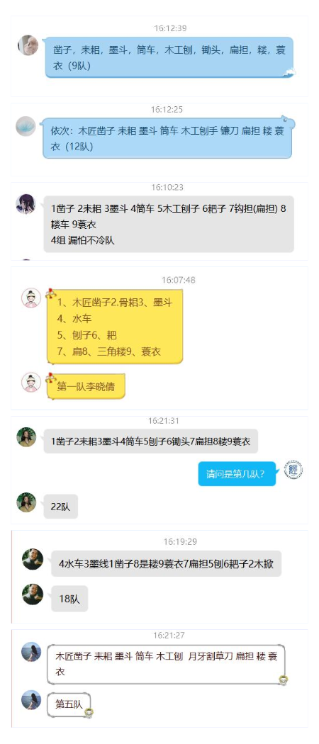 各小队领到任务后,充分调动起手中的资源,或是运用各种搜索引擎,或是调动起脑海中的记忆,努力识别每一种劳动工具,最终将本队答案“秘密”上传。无论通过怎样的方式了解这些劳动工具,同学们在整个过程中对于我国古代劳动工具都有了更深的了解,也更惊叹于我国劳动人民的智慧。