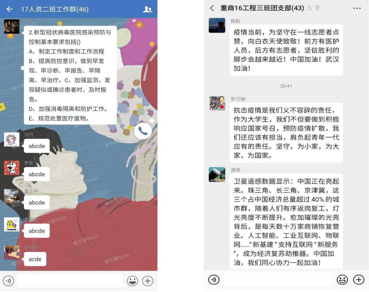 各团支部结合青年学生的特点和喜好,以大家乐于接受和易于接受的方式,融入形式多样、各具特色的活动内容,激发广大青年团员的使命担当,明确抗疫责任要求。有的支部高声齐唱团歌,“我们是五月的花海,用青春拥抱时代……”高昂雄壮的歌声随着网络传向祖国的四面八方,让广大团员感受到了团组织的凝聚力和号召力;有的支部通过线上连麦宣讲防疫小知识,提醒团员同学保护好自身安全,不为国家社会抗疫斗争增加负担,坚决打好这场病毒防疫战;有的支部在线上观看各大防疫战线上逆行者们美丽的身影,将一幅幅感人的画面、一句句温暖的话语,深深地印入了眼里、耳里和心里,在青年团员心中激起一股股无形的强大力量,那就是一定要努力学习,争取以后为国家、为社会、为人民做出更多的贡献;有的支部组织防疫知识竞答比赛,通过抢答方式组织团员同学学习防疫知识,增强防疫意识,提升防疫能力,坚决做到抗疫关键时期不松懈、不懒散、不添乱。此外,有的团支部还号召广大青年团员高效利用宅家时间,认真学习网课,认真完成作业,积极拓展阅读,开展体育锻炼,帮助父母多做家务,体谅父母艰辛,承担为人子女应尽的责任和义务。