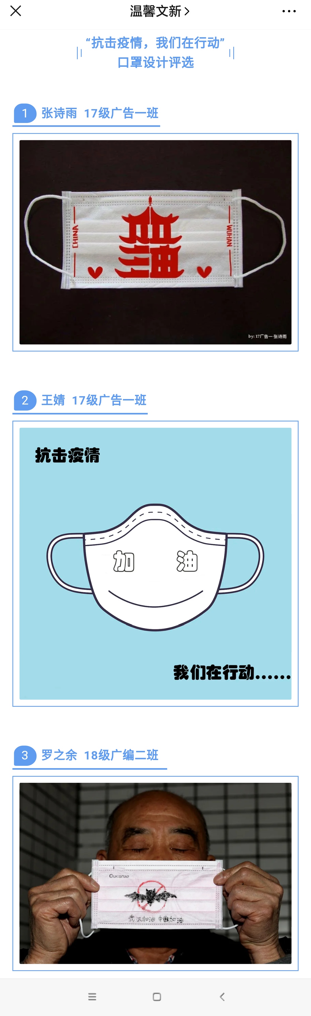 本次活动为期一个月,采用线上举行,截至2月18日,文学与新闻学院举办的“抗击疫情,我们在行动”系列活动已收集到248份作品,投稿作品分为文字类、图文类、视频类三个大类,共有宣传语、诗歌、短视频、海报设计、手抄报设计、口罩设计、美食你我晒等七个小类。投稿作品内容多为宣传防疫知识,不信谣不传谣,对此次疫情的观点和看法,以及致敬一线最美“逆行者”等。
