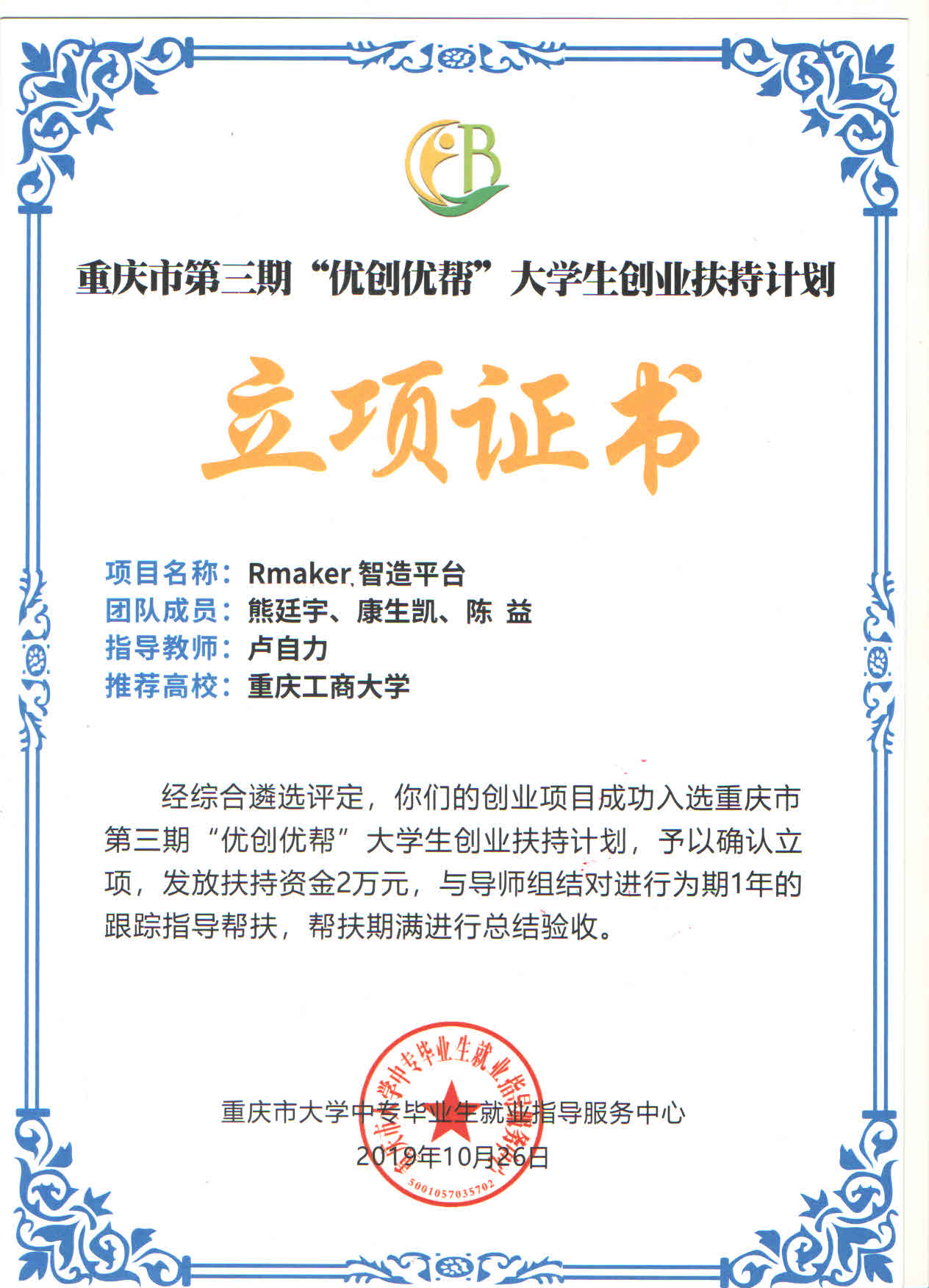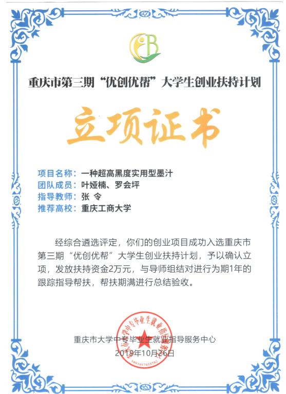 在刚刚结束的重庆市大学中专毕业生就业指导服务中心举办的第三期“优创优帮”大学生创业扶持计划市级总评审中,我校计算机信息工程学院2016级在校生熊廷宇团队的创业项目“RMaker制造平台”和财政金融学院2016级在校生叶娅楠团队的创业项目“一种超高黑度实用型墨汁”获得创业扶持资助。