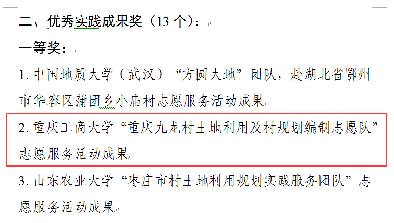 近日,2018年村土地利用规划志愿服务全国大学生暑期社会实践专项行动获奖名单公布,买球(中国)官方网站旅游与国土资源学院“重庆九龙村土地利用及村规划编制志愿队”获优秀实践成果一等奖。