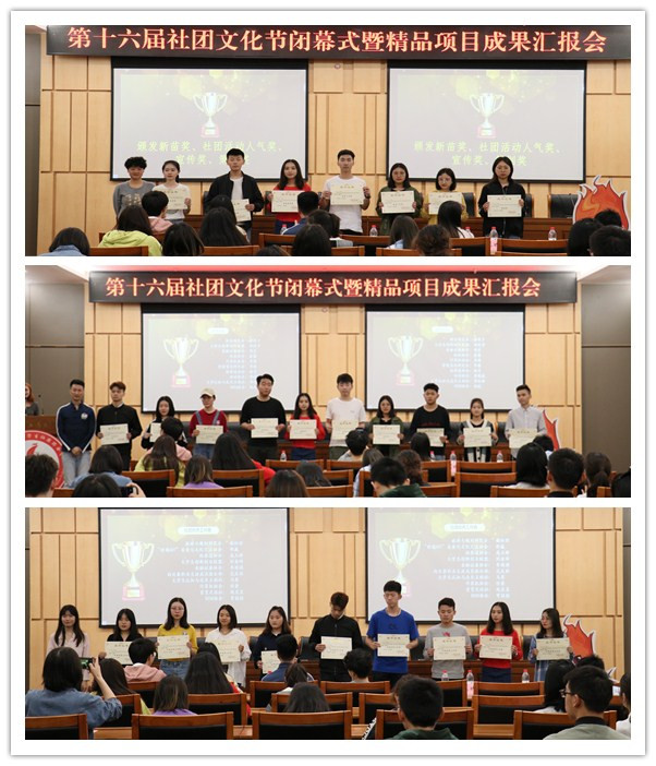 活动中,优秀社团和优秀成员获得了表彰。向日葵职业生涯成长俱乐部、天木槿音乐协会、大学生认知与成长互助社、BIM协会等7个社团获得新苗奖、社团活动人气奖、宣传奖及策划奖;廖佳于、胡莉莎、冉倩、李敏、杨雯等10位社团会长获得优秀社团会长奖;谢松琼、范庆秋、李琪琪、马琴、任豪等10位社团成员获得了社团优秀工作者奖。