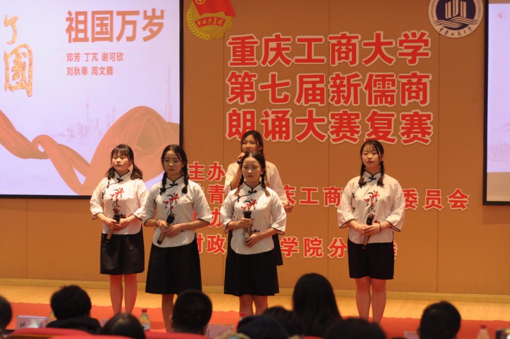 本次比赛参赛选手以团队朗诵的形式进行表演。比赛以来自通识学院的《祖国,以梦为马》拉开了帷幕。选手们激情盈溢,语言流畅,朗诵风格也各不相同。来自各学院的29支队伍的倾力表演让台下观众产生了强烈的情感共鸣,也赢得了大家的赞叹与掌声。最终,商务策划学院的《请铭记,雾重庆》、经济学院的《给小平同志的100首诗》、管理学院的《我的南方和北方》、财政金融学院的《船长礼赞》等12个节目脱颖而出,成功晋级决赛。