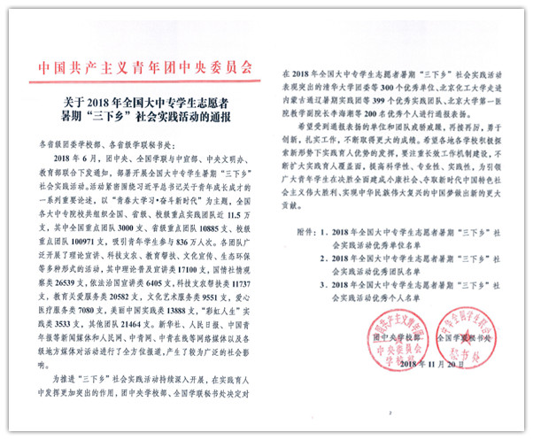 11月16日,全国大学生志愿服务西部计划项目管理办公室下发了《关于对在2018年西部计划招募宣传工作中表现突出的项目办进行通报表扬的通知》,对包括我校在内的185个高校项目办提出通报表扬。11月20日,团中央学校部、全国学联秘书处下发了《关于2018年全国大中专学生志愿者暑期“三下乡”社会实践活动通报》,我校校团委获评全国优秀单位(全国共评选300个)。