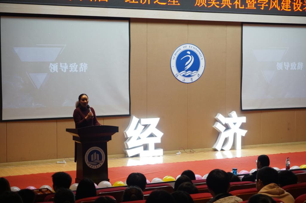 10月12日下午,经济学院第四届 “经济之星”颁奖典礼暨学风建设表彰大会在田家炳209报告厅举行。学院党委书记王小玲、党委副书记于频、学院“巴渝学者”谢新、国贸系主任蒋兴红、贸经系主任杨海丽、会展系主任林黎、经济学系何泱泱、教务办严艳及学团办全体辅导员出席了本次表彰大会。