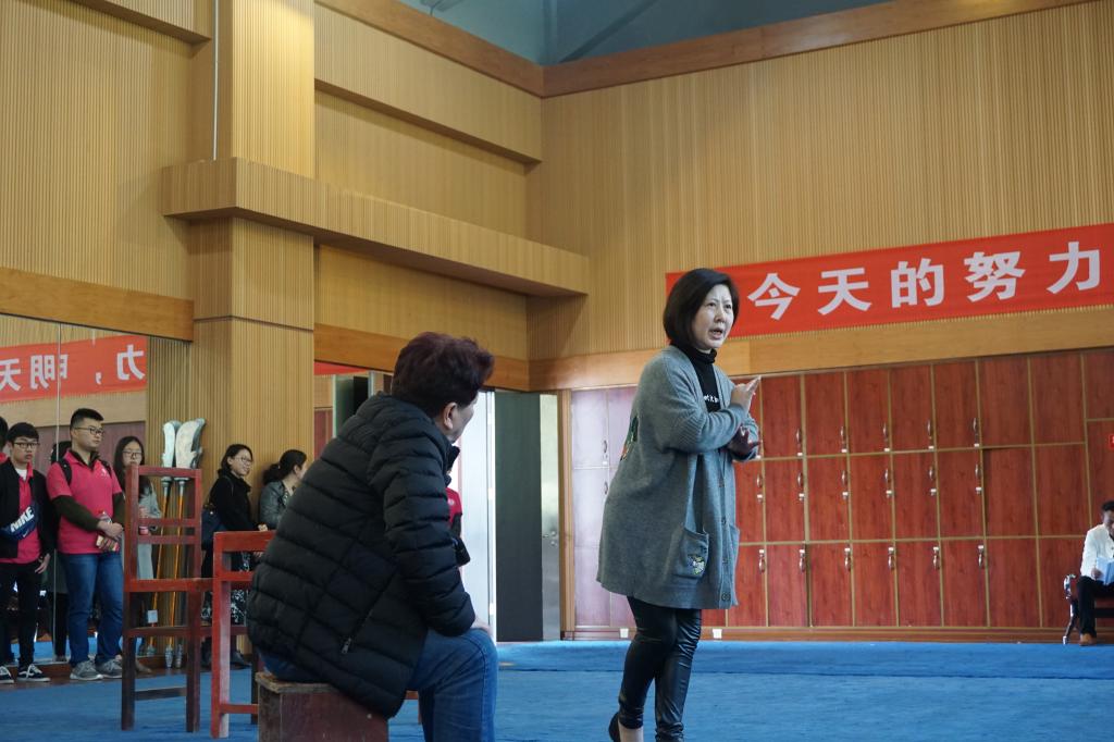 活动的最后一个环节,张严威给大家介绍了古时候的戏台构造,同时介绍戏曲演员的高亮嗓门和热闹的锣鼓主要源于古时吸引四面八方的观众。张严威带领同学们学习古时女子的步态,邀请两名同学现场教学古时男女相见的场景。他惟妙惟肖的演绎和同学活灵活现的模仿,引得现场掌声连连,欢笑阵阵。同学们纷纷表示收益良多,真正感受到了川剧的魅力。
