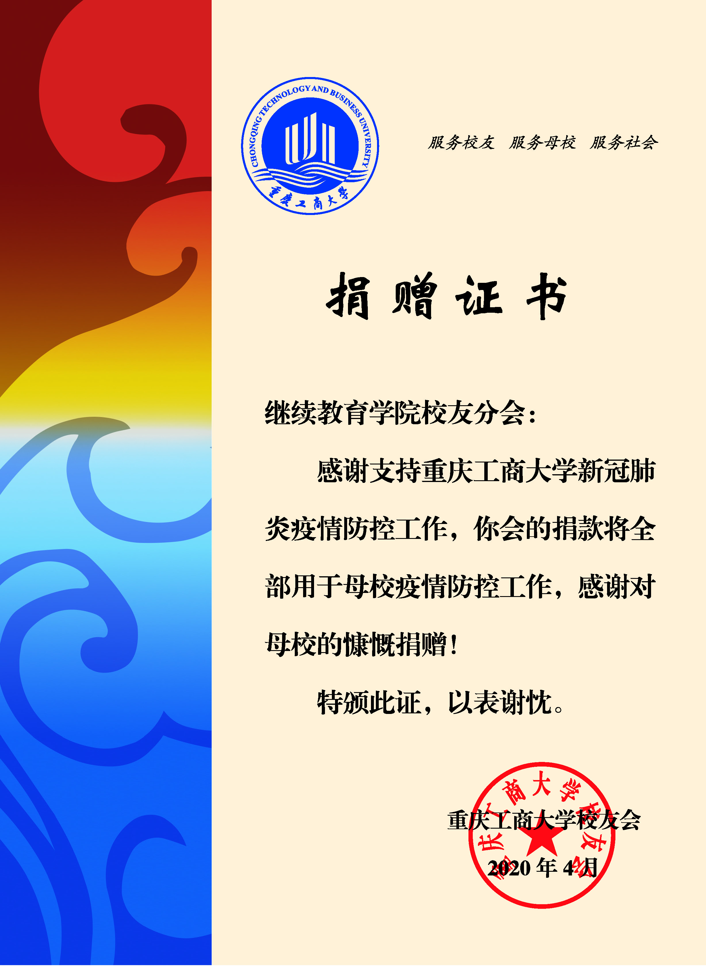 自疫情爆发以来,继续教育校友主动与学校联系,在了解母校疫情抗击情况后,分会秘书处发出捐款倡议, 齐心与母校并肩战斗。继续教育学院广大校友第一时间积极响应,纷纷自愿捐款,筹集到8346.80元善款,定向用于我校抗疫工作。继续教育学院校友分会会长杜伟说:“重工商大永远是我们的家。聚沙成塔,滴水泉涌,希望大家都能为母校的疫情防控尽一份绵薄之力。”