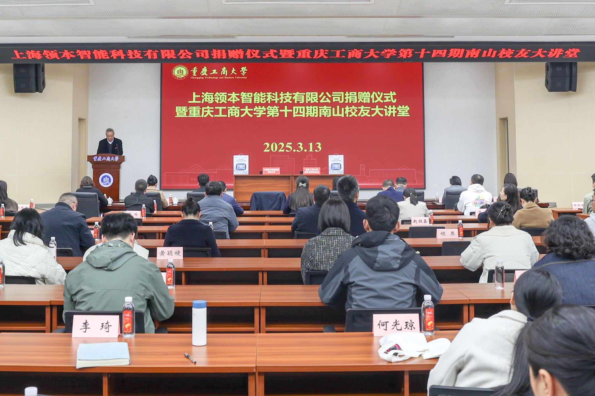 3月13日上午,上海领本智能科技有限公司捐赠仪式暨买球(中国)官方网站第十四期南山校友大讲堂在明德楼天健报告厅举行。学校党委副书记宋豫、党委常委、副校长李国军,上海领本智能科技有限公司创始人兼CEO、2009届机械专业校友王军博士出席捐赠仪式。捐赠仪式由李国军主持。